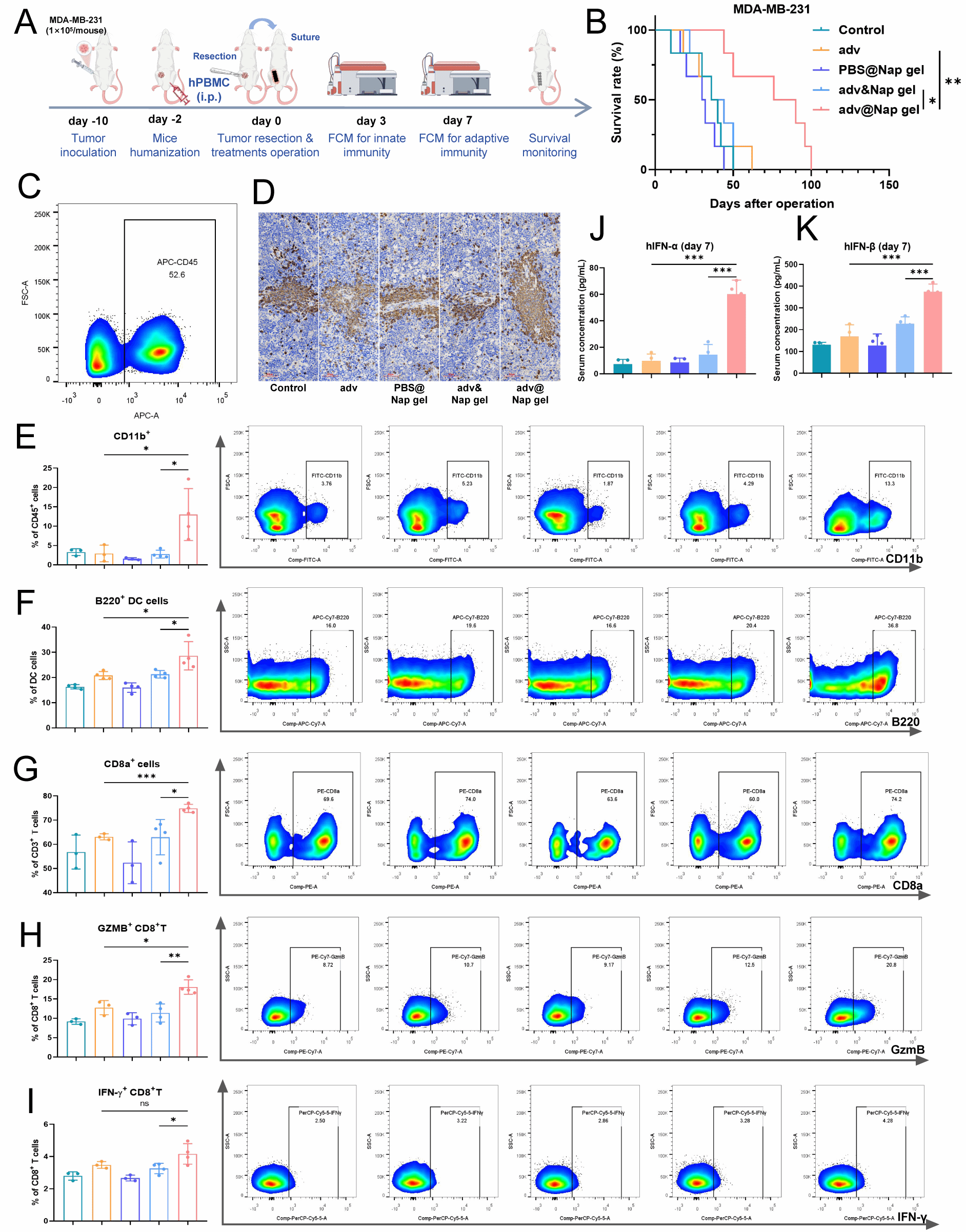 团队使用MDA-MB-231在免疫系统人源化小鼠中成功构建了具有高度临床相关性的三阴性乳腺癌(TNBC)原位模型。,证实了在肿瘤切除后立即植入adv@Nap gel可以诱导抗肿瘤免疫反应和I型干扰素通路的激活,并在手术后控制肿瘤复发,展现了巨大的临床转化前景。