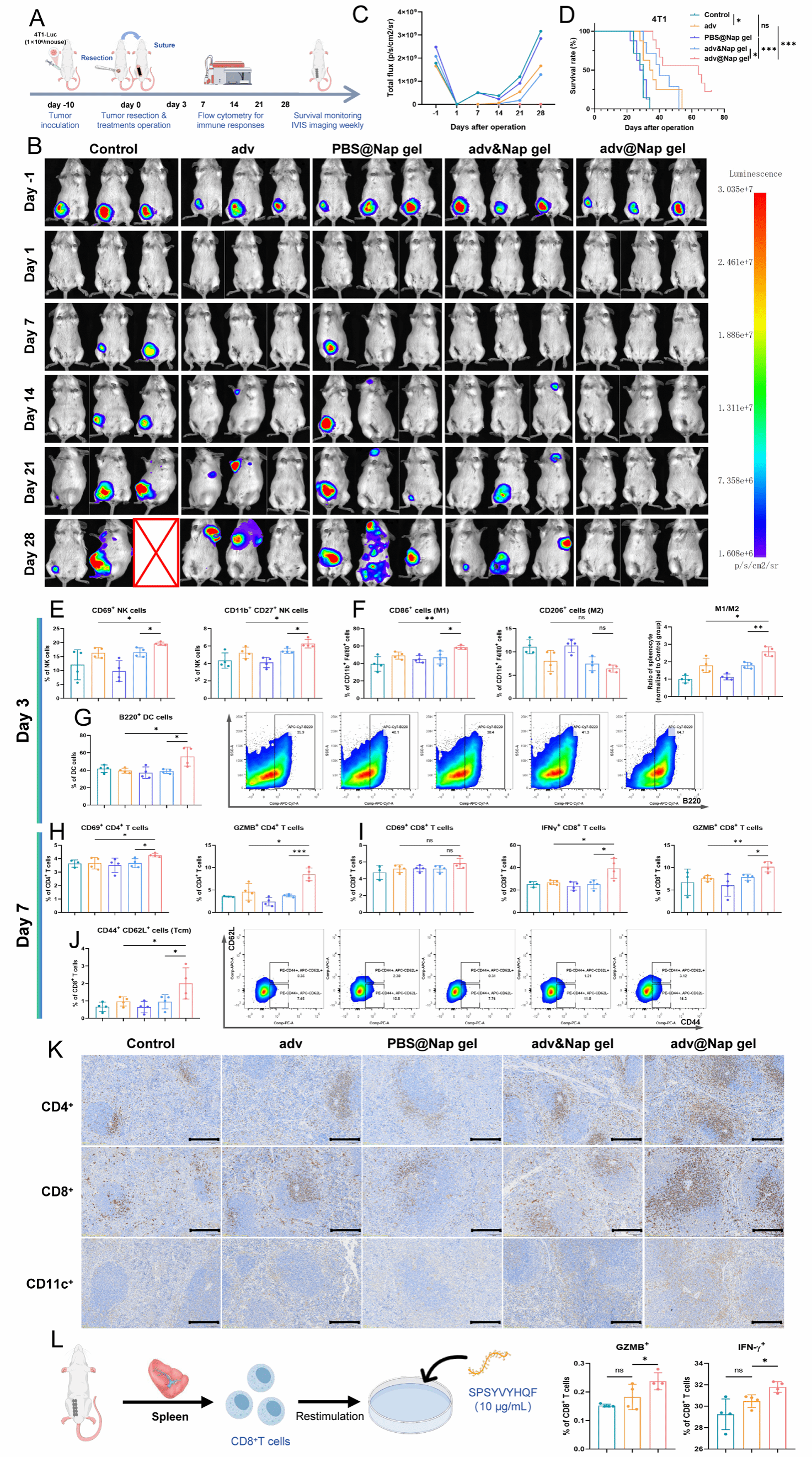 图3 始于术中原位放置adv@Nap gel可以控制肿瘤复发和转移,激活抗肿瘤免疫反应。