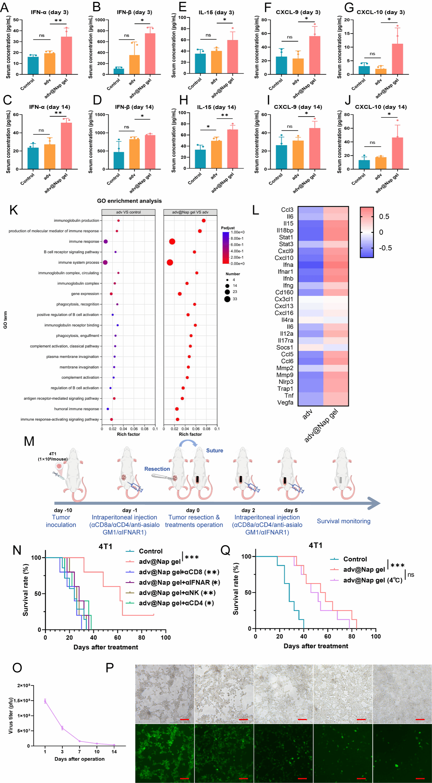 在本研究中,团队实现了溶瘤病毒(adv、HSV或VV)始于术中的手术原位的持续释放。这一治疗方式能迅速激活I型干扰素通路,诱导先天性和适应性免疫反应应答,控制肿瘤术后复发和转移,并延长小鼠存活时间。团队验证了使用adv@Nap gel进行即时原位治疗能够抑制肿瘤术后复发的能力。值得注意的是,附载在Nap gel中的HSV或VV也能控制肿瘤术后复发。