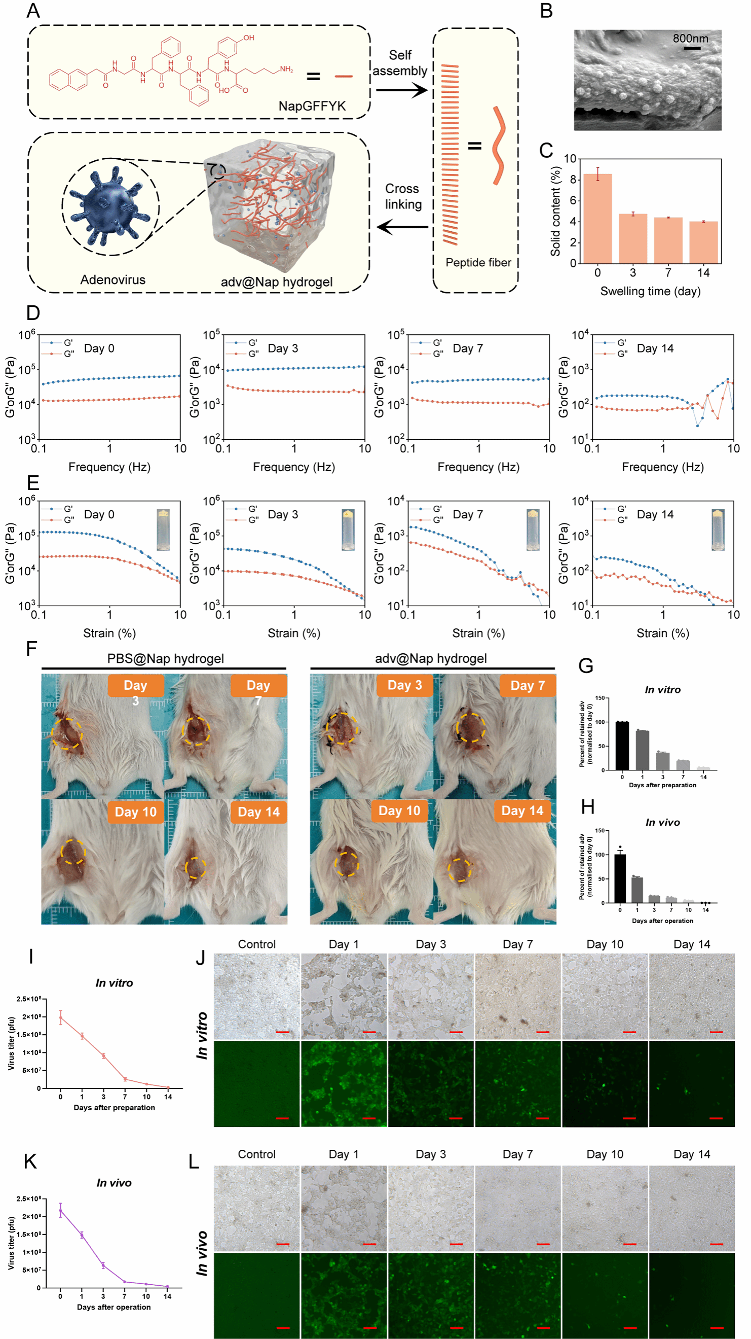 腺病毒adv激活免疫记忆反应是其能够抑制肿瘤术后复发的潜在能力的前提条件。为了解决在肿瘤组织被移除后溶瘤病毒原位治疗不可行的问题,团队采用了能够在体内实现局部药物输送的自组装多肽水凝胶系统(NapGFFYK hydrogel),该系统保证了水凝胶基质随时间逐渐降解而实现溶瘤病毒的原位持续释放。adv@Nap gel的机械稳定性对于其作为病毒载体的应用至关重要。流变学特性的检测证明adv@Nap gel可在体外或体内持续保持机械稳定性。PCR及TCID50证明adv@Nap gel可在体外或体内持续释放adv,并维持病毒的感染活性。