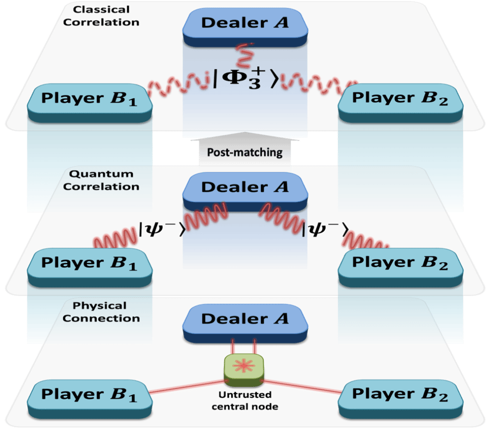 近期,南京大学物理学院、固体微结构物理全国重点实验室、人工微结构科学与技术协同创新中心陈增兵教授和中国人民大学物理学院、量子态构筑与测控教育部重点实验室尹华磊副教授团队实现了一种兼具高效率和可拓展性的量子秘密共享协议。该协议利用两体纠缠态和测量后匹配方法在多个用户之间建立等效的多方GHZ关联,避免了CHZ纠缠态产生与分发的困难,具有通信效率高、可拓展性强、无需多用户时间同步和符合响应的优势。本工作对量子秘密共享协议在实用化量子通信网络中的应用具有重要意义。
