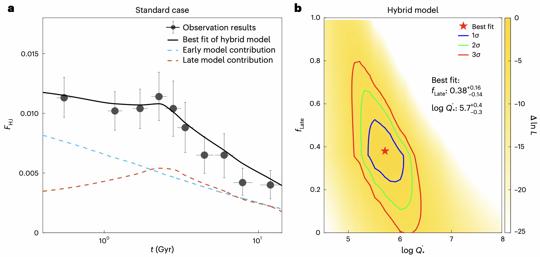 通过将观测结果与理论模型对比,研究团队进一步定量限定了热木星形成机制的贡献比率(见图3),结果表明大部分(约60%)的热木星是在早期(千万年内)到达恒星附近的,而约40%的热木星则是通过“长期混沌”机制在数千万年到数十亿年的时标上被不断输送到恒星附近。研究团队还给出了类太阳恒星的潮汐因子(Q*)限定,约为10的5.4到6.1次方。这一结果预期的可观测轨道衰减的热木星数目与观测十分一致,也为热木星的轨道衰减提供了大样本的观测证据。