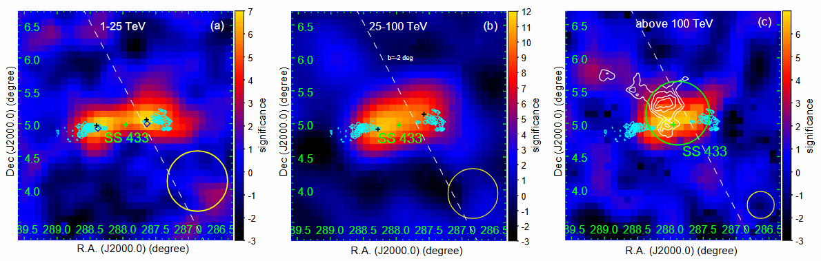 图 1 拉索测量到的SS 433区域伽马射线显著性天图。左图:1-25TeV;中图:25-100TeV;右图:100TeV以上。图中青色十字代表黑洞的位置,青色的等高线为X射线瓣状结构,产生于黑洞双侧喷流与星际介质的相互作用。右图中白色等高线代表与SS 433相近距离上的原子云柱密度分布。