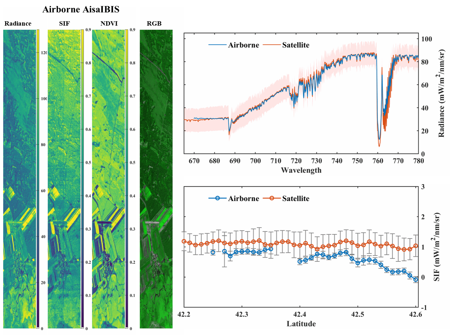 在轨验证阶段,国家林业和草原局林草调查规划院组织实施了“星—机—地”一体化联合观测实验。2023年8月22日至9月2日,在河北塞罕坝地区同步开展卫星过境观测、无人机与地基光谱观测,并在不同生态类型下布设塔基观测点,形成跨尺度比对链路。结果表明,卫星、航空与地面观测在光谱测量与SIF反演结果上保持高度一致,有效验证了产品的稳定性与准确性。