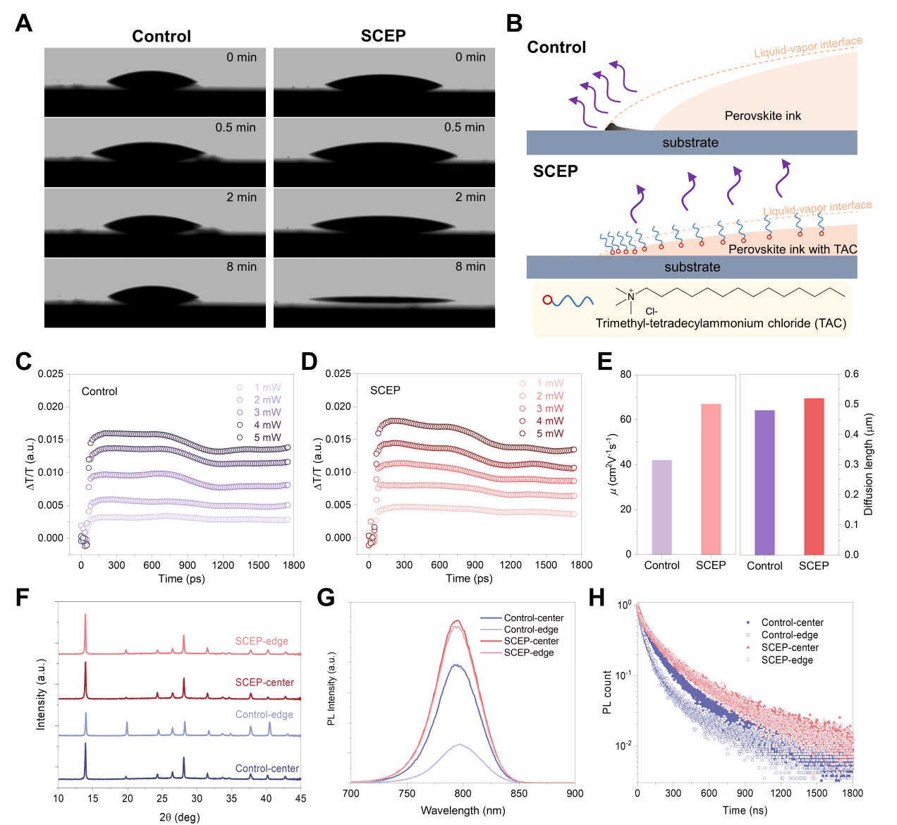 图2.钙钛矿薄膜表征。(A)对照组与SCEP钙钛矿墨滴的接触角图像。(B)钙钛矿湿膜溶剂蒸发示意图。(C和D)基于太赫兹(THz)测量的对照组(C)与SCEP(D)钙钛矿薄膜载流子动力学。(E)基于太赫兹分析的对照组与SCEP钙钛矿薄膜迁移率(左)及扩散长度(右)。(F)XRD图谱,(G)稳态光致发光光谱,(H)对照组与SCEP钙钛矿薄膜中心与边缘区域的时间分辨光致发光曲线。