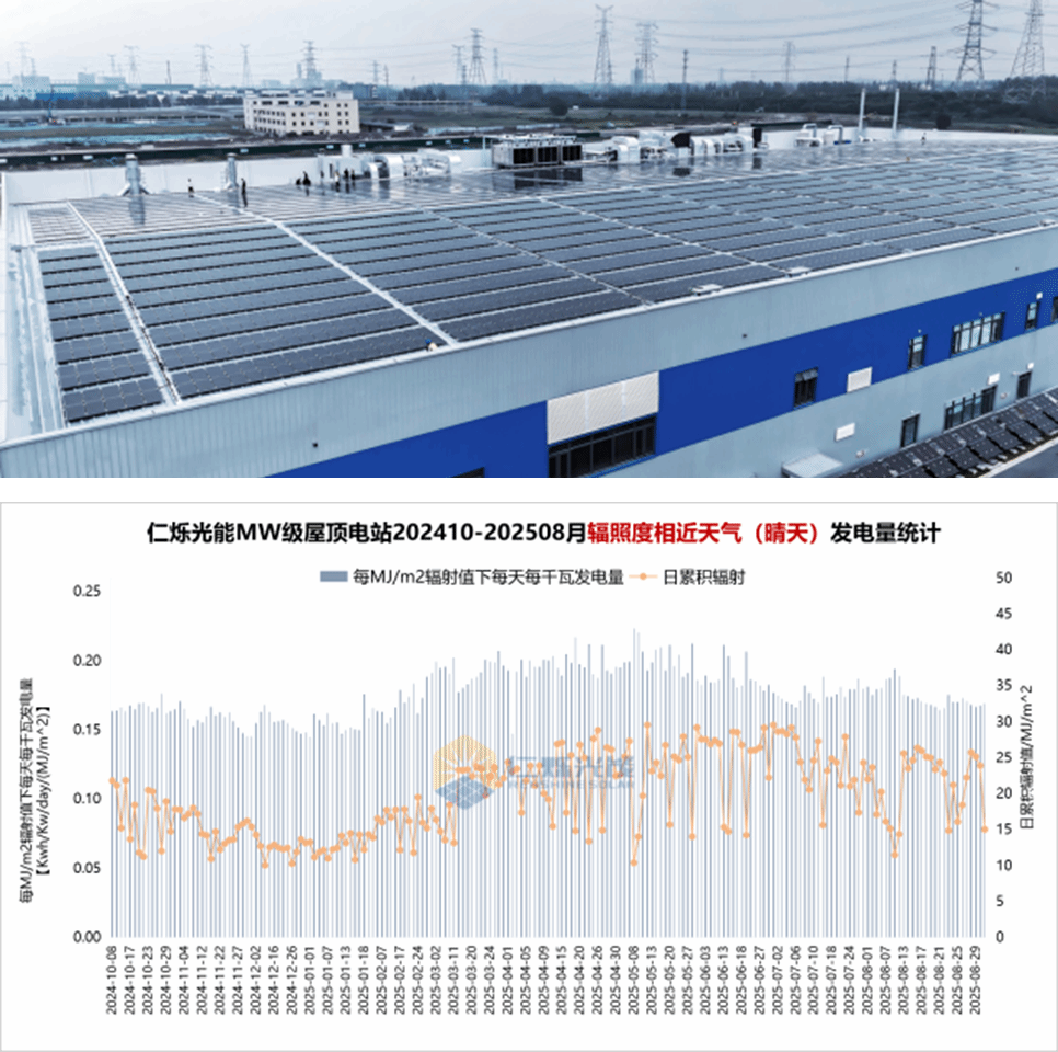 图5.仁烁光能MW级钙钛矿组件示范项目及组件发电量同辐照关系