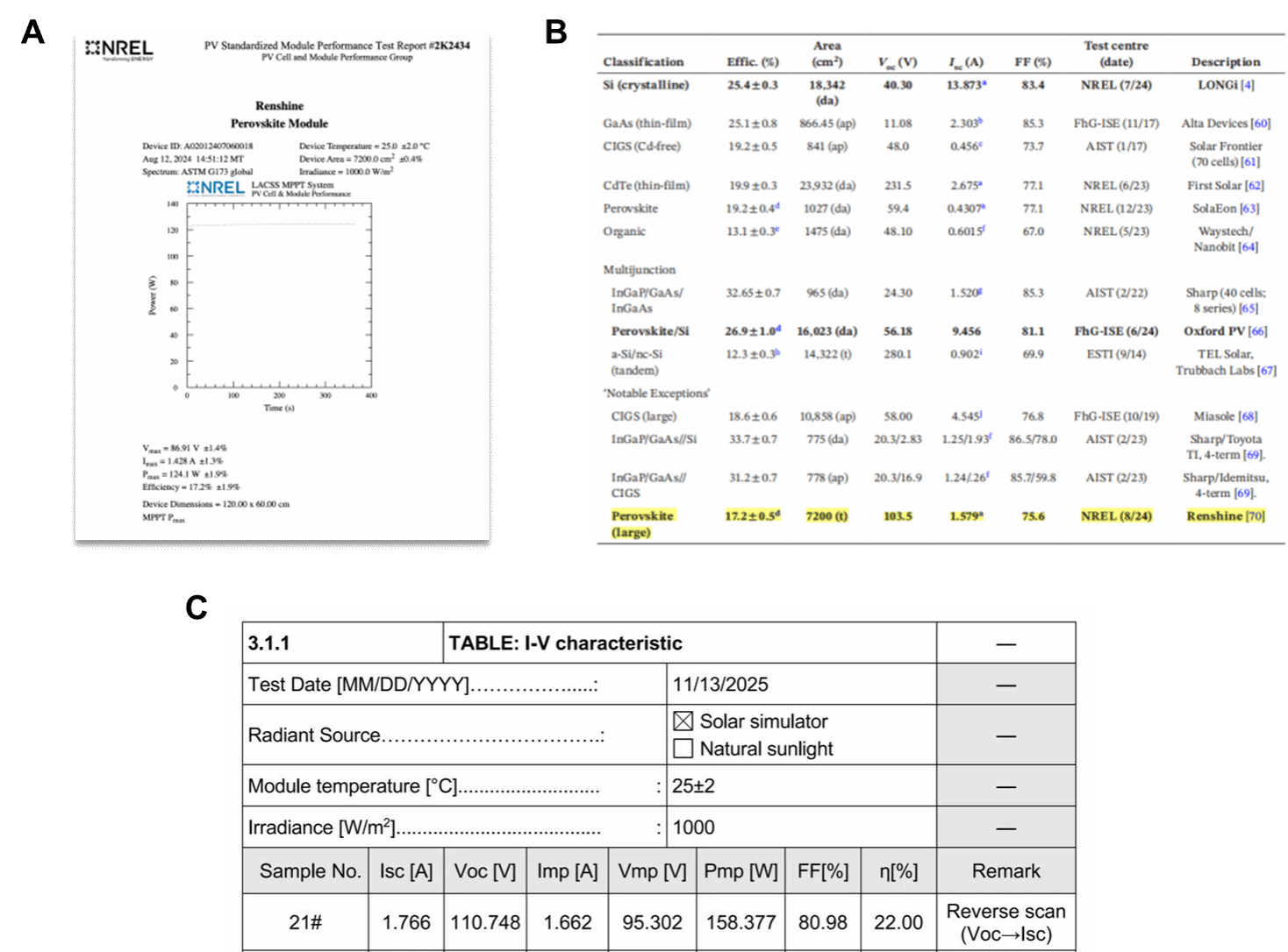 图3.平米级钙钛矿光伏组件。(A)NREL认证钙钛矿光伏组件稳态效率17.2%(2024年钙钛矿商业组件效率世界纪录)。(B)太阳能电池世界纪录效率表(Version 65)。(C)最新TÜV南德认证效率达22%,再创新的世界纪录效率。