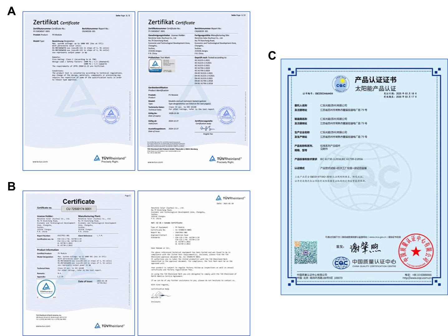 图4.组件可靠性及质量认证。(A)德国莱茵TÜV全序列IEC认证证书。(B)美国UL认证证书。(C)中国质量认证中心产品认证证书。