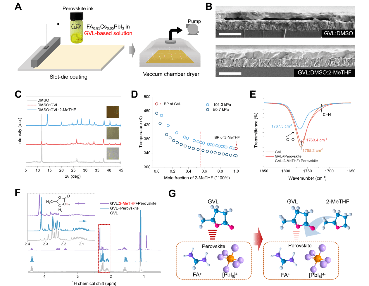 图1.采用GVL/DMSO/2-MeTHF混合溶剂体系制备钙钛矿薄膜。(A)狭缝涂布法和VCD工艺大规模制备钙钛矿薄膜的过程。(B)钙钛矿薄膜横截面SEM图像。(C)VCD后的钙钛矿薄膜中间相对比。(D)GVL/2-MeTHF混合液的等压气液平衡图。(E和F)钙钛矿的FTIR光谱(E)和1H核磁共振谱(F)。(G)GVL和2-MeTHF与钙钛矿的配位结构示意图。