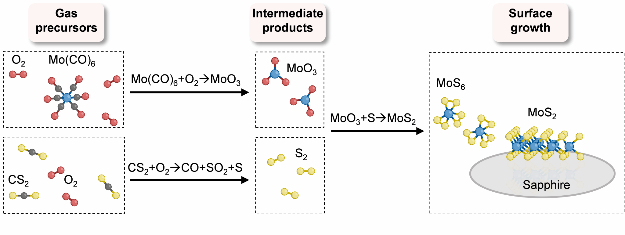 针对上述难题,团队提出全新解决方案:首次采用无氢、低碳的二硫化碳(CS2)作为硫源,从源头减少杂质引入。进一步开发oxy-MOCVD技术,通过引入氧气,在高温下与前驱体充分预反应,生成高纯度和高活性反应中间体,实现了生长动力学的精准调控。相比传统反应路径,反应能垒从2.02 eV降至1.15 eV,显著提升反应动力学速率;同时从根源上抑制含碳中间体的形成,避免碳污染,为大面积、高质量、高均匀性MoS2的外延生长筑牢根基。