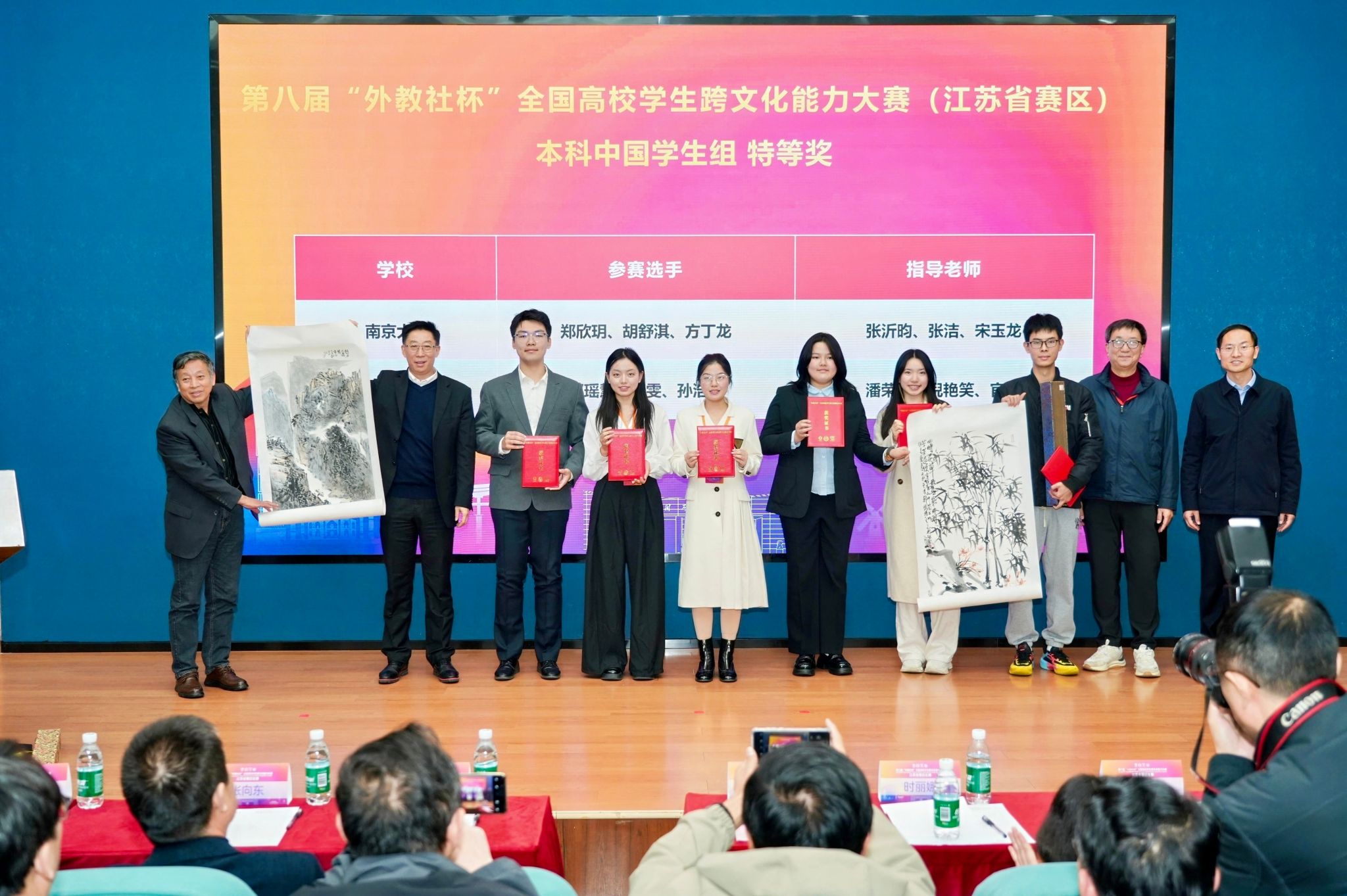 南京大学大学外语部的张沂昀、张洁、宋玉龙三位老师共同指导的郑欣玥、胡舒淇、宋玉龙三位同学获得本届“外教社杯”跨文化能力大赛江苏省赛区本科中国学生组特等奖,并晋级将于2025年12月11日至14日在上海外国语大学举行的全国决赛。