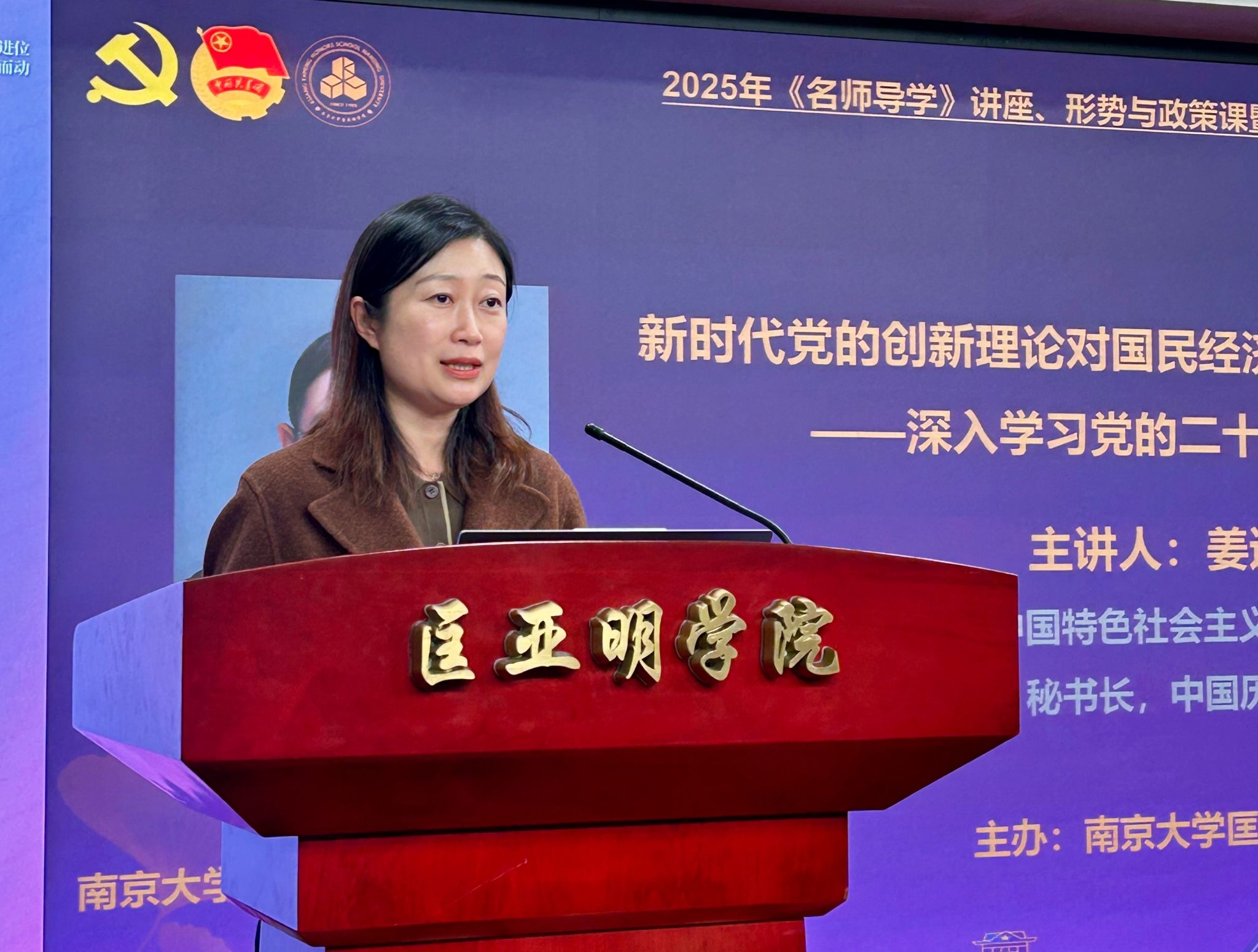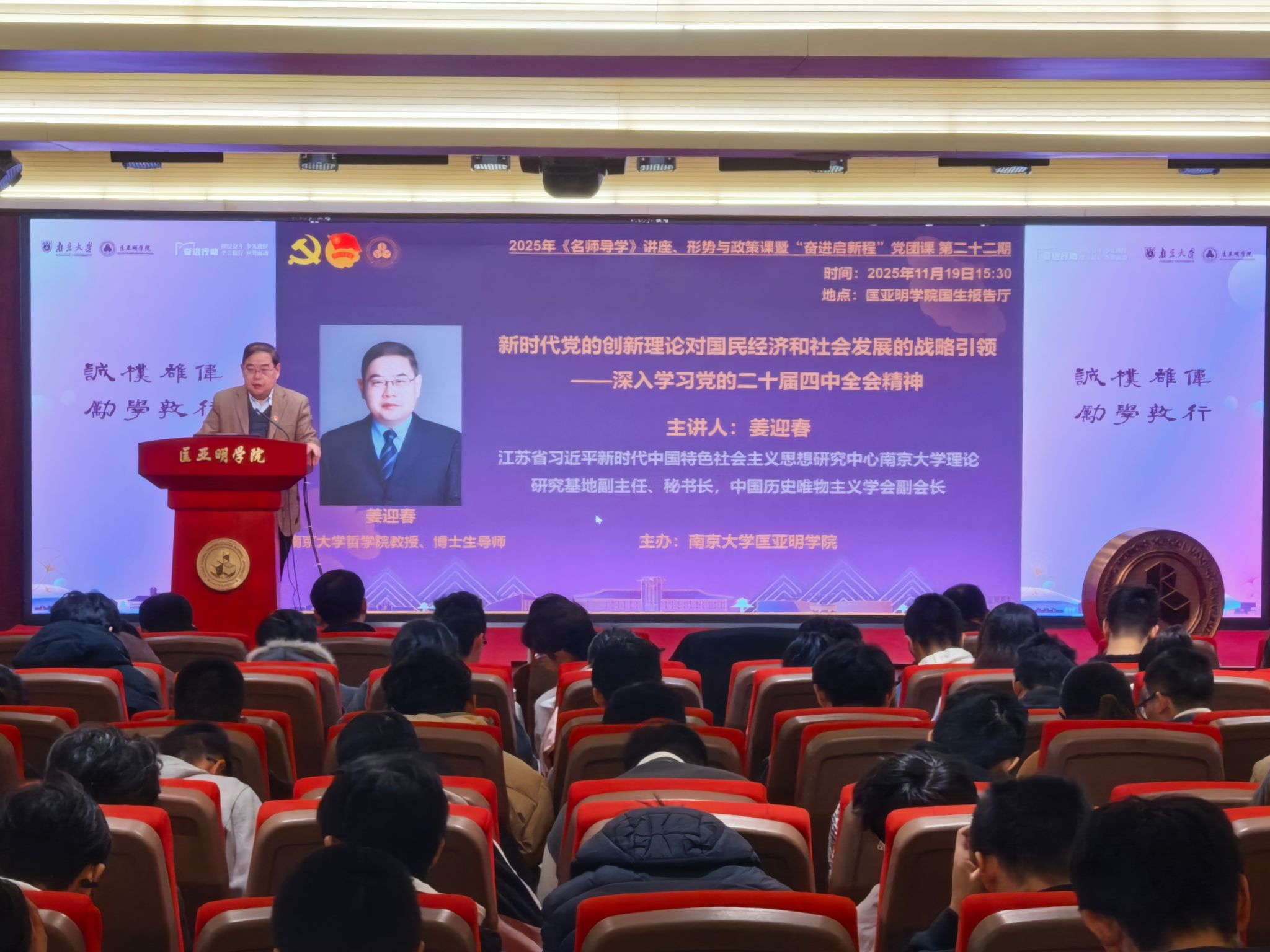 11月19日,匡亚明学院举办“奋进启新程”党团课暨《名师导学》课程,专题学习党的二十届四中全会精神。江苏省习近平新时代中国特色社会主义思想研究中心南京大学理论研究基地副主任、中国历史唯物主义学会副会长、哲学学院教授姜迎春做题为“新时代党的创新理论对国民经济和社会发展的战略引领——深入学习党的二十届四中全会精神”的专题报告。课程由匡亚明学院党委书记周媛主持。