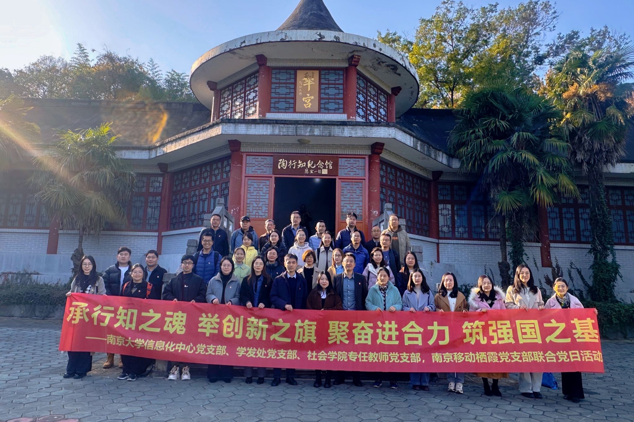 为深入贯彻落实教育强国战略部署,凝聚跨领域协同奋进力量,扎实服务南京大学“双一流”建设新征程,以实际行动诠释“教育强国,奋进有我”的责任担当与使命初心,11月26日,南京大学信息化中心党支部、学科建设与发展规划处党支部、社会学院专任教师党支部与南京移动栖霞党支部携手联动,共同开展了主题鲜明、内涵深厚、形式丰富的联合支部共建活动。本次活动以“承行知之魂、举创新之旗、聚奋进合力、筑强国之基”为核心主线,通过参访陶行知纪念馆与中国移动展示体验中心,架起教育精神传承与科技创新实践的沟通桥梁,实现了思想洗礼与实践赋能的双向奔赴。