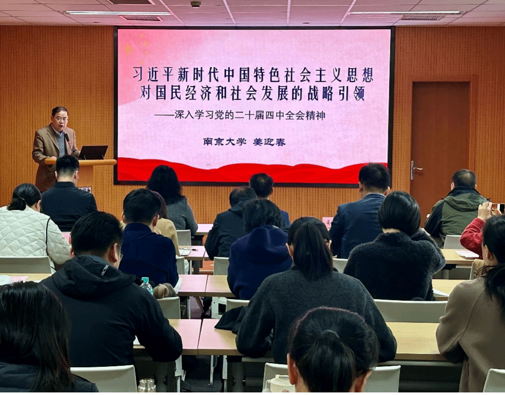 哲学学院教授姜迎春受邀讲授“习近平新时代中国特色社会主义思想对国民经济和社会发展的战略引领”主题党课,带领全体党员学习领会党的二十届四中全会精神。姜迎春指出,党的二十届四中全会是在向第二个百年奋斗目标进军的新征程上举行的一次十分重要的会议,会议审议通过了“十五五”规划,为今后五年我国发展指明了方向与路径,作出顶层设计和战略擘画。他从“以实现社会主义现代化为战略方向”“以发展新质生产力为战略驱动”“以构建总体国家安全为战略保障”“在把握世界大变局中保持战略定力”四个层面深入浅出地阐释了党的二十届四中全会精神的核心要义与丰富内涵,并强调要增强历史自觉、政治自觉和行动自觉,加强党的全面领导,强化党的建设,积极投身中国式现代化建设伟大征程。