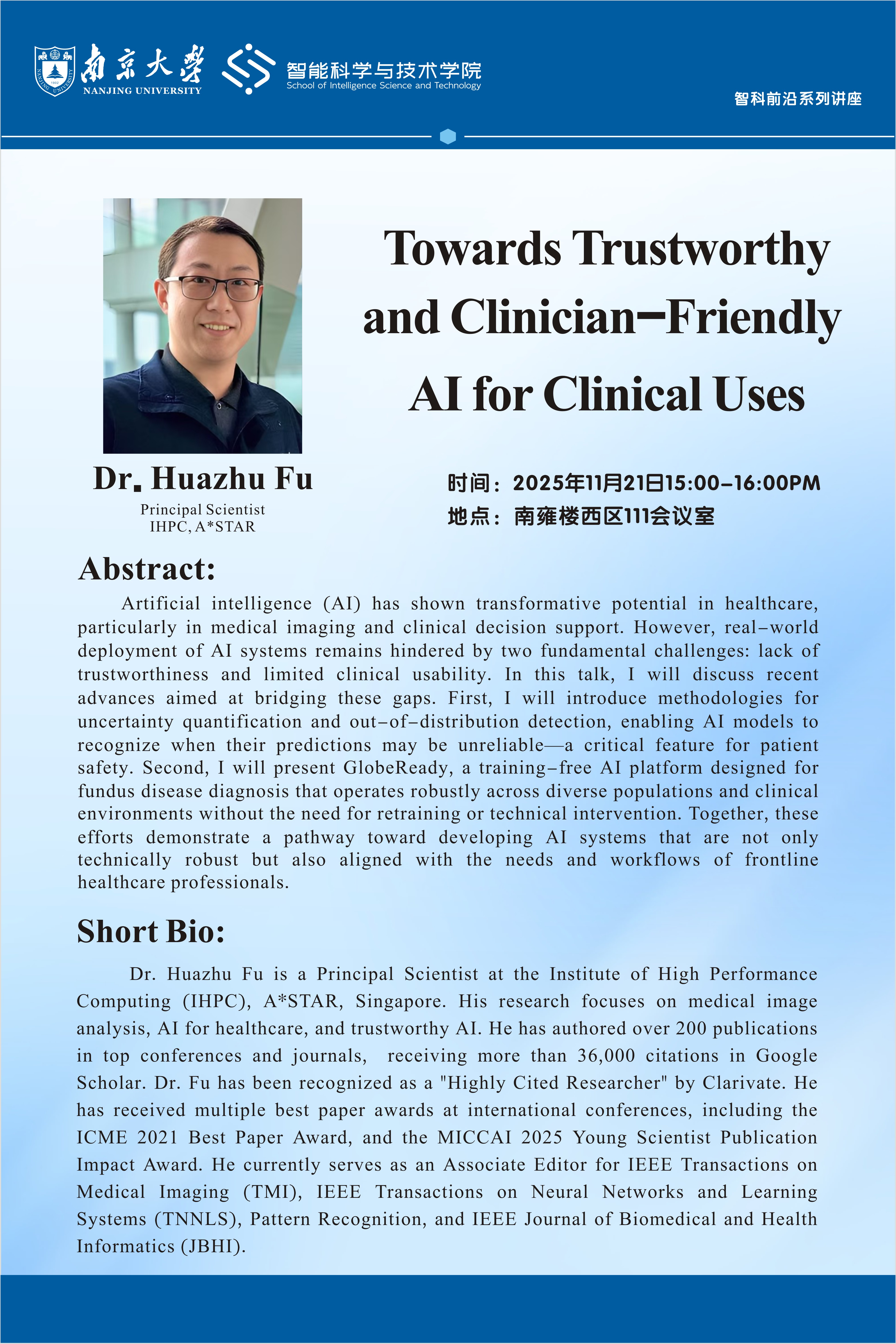 2025年11月21日,我院邀请到了付华柱教授于南雍楼西区111会议室作题为《Towards Trustworthy and Clinician-Friendly AI for Clinical Uses》的主题讲座。