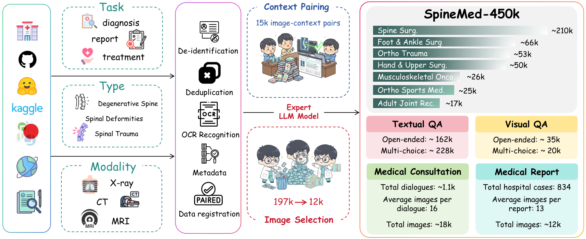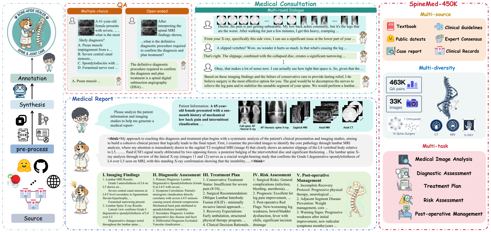 规模与来源:包含超过450,000条指令实例。数据来源极其丰富,包括教科书、外科指南、专家共识、开放数据集(如Spark、VerSe 20202020),以及约1,000例去识别化的多模态医院真实病例。真实病例来源于国内11家知名医院,确保了患者来源的多样性 。