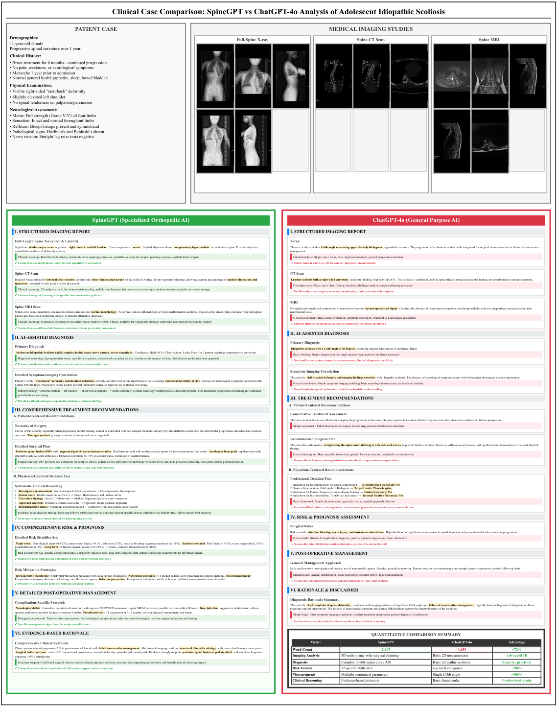 案例对比:在对“青少年特发性脊柱侧凸”病例的分析中,SpineGPT提供了包含72个详细的临床处理流程,涵盖了完整的影像发现、AI诊断、患者和医生导向的治疗建议、风险管理和术后问题管理。相比之下,ChatGPT-4o的报告则更偏向于适合一般医疗文档的基本诊断和治疗建议。