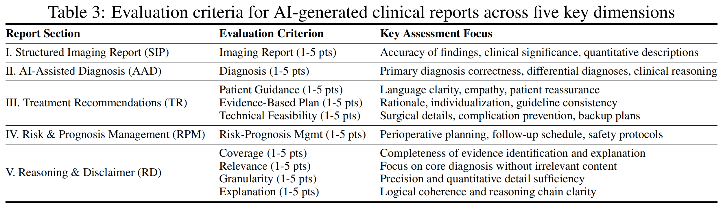 报告评估:针对临床报告生成任务,设计了由专家校准的框架。评估从五大板块、十个维度进行: