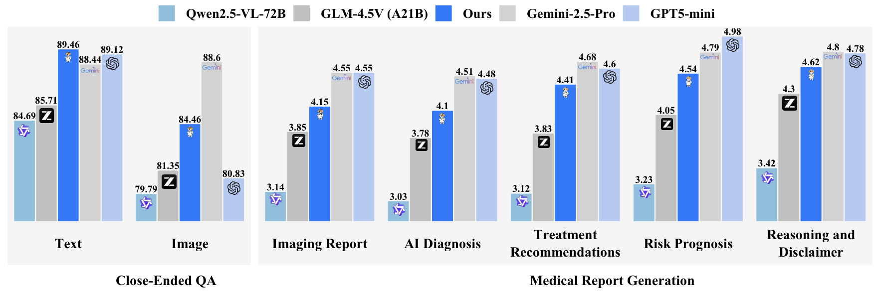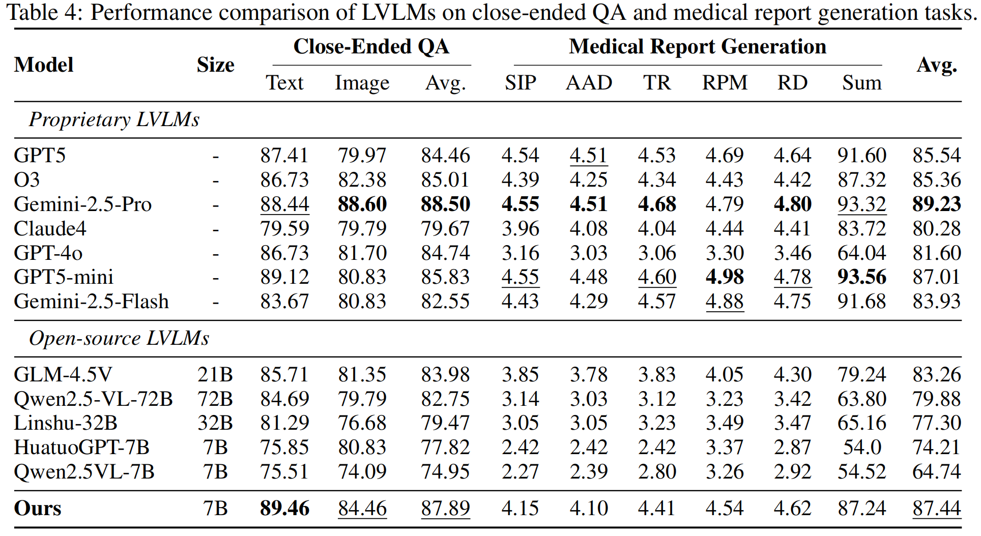 性能差距明显:即使是参数量达72B的Qwen2.5-VL-72B,平均性能也仅为79.88%。领先的开源模型GLM-4.5V (83.26%)与顶尖专有模型Gemini-2.5-Pro (89.23%)之间仍存在近6个百分点的差距。在医疗报告生成任务中,更是差距明显,Qwen2.5VL-72B和Gemini-2.5-pro差30%。