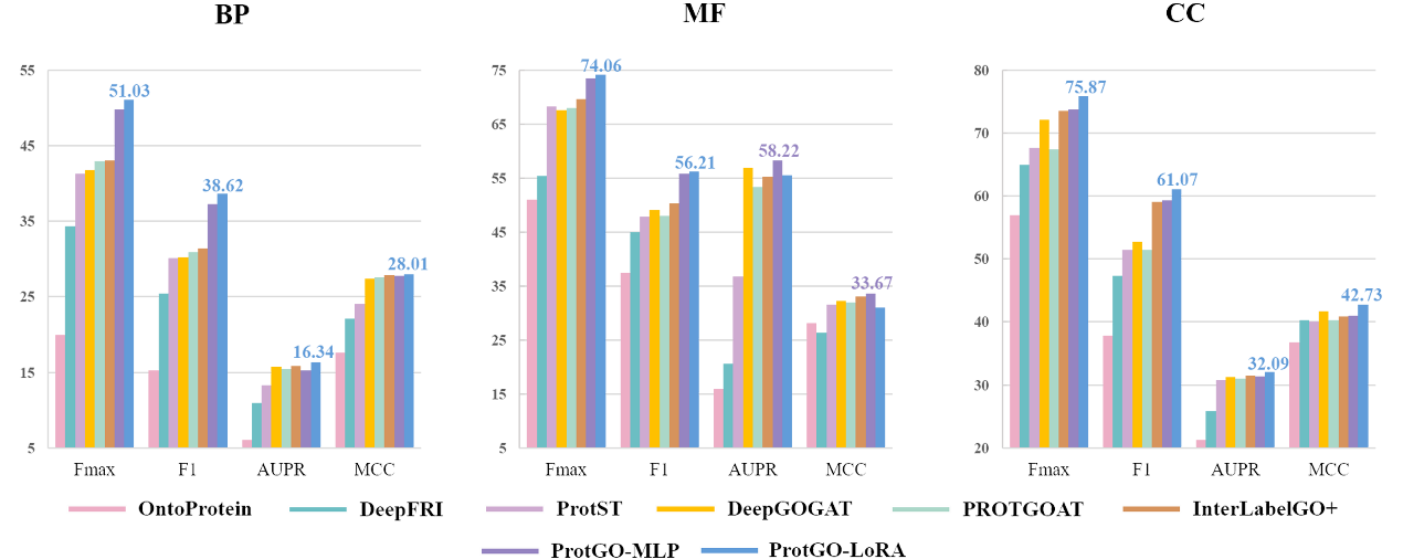 大量实验表明ProtGO强化后的PLM相较于原始的PLM,在最大F1值(maximum F1 measure,简称为Fmax)上有8%到27%的提升,可以有效提升各种PLM在GO预测任务上的精度,大幅度地超越了相关经典GO预测模型的预测精度(如图4)。该方法发表于Bioinformatics期刊。