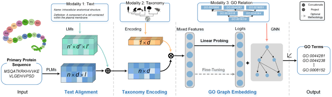 ProtGO作为一个通用的蛋白质功能预测模型,其可充分利用不同模态的知识,通过认知的整合性,整合了蕴含于基因本体(Gene ontology,简称为GO)所涉及的蛋白质序列、描述性文本、生物学分类和标签图结构,发掘其中共同关联的功能和进化信息形成统一的知识(如图3),是现今最有效的蛋白质面向GO功能预测模型之一。