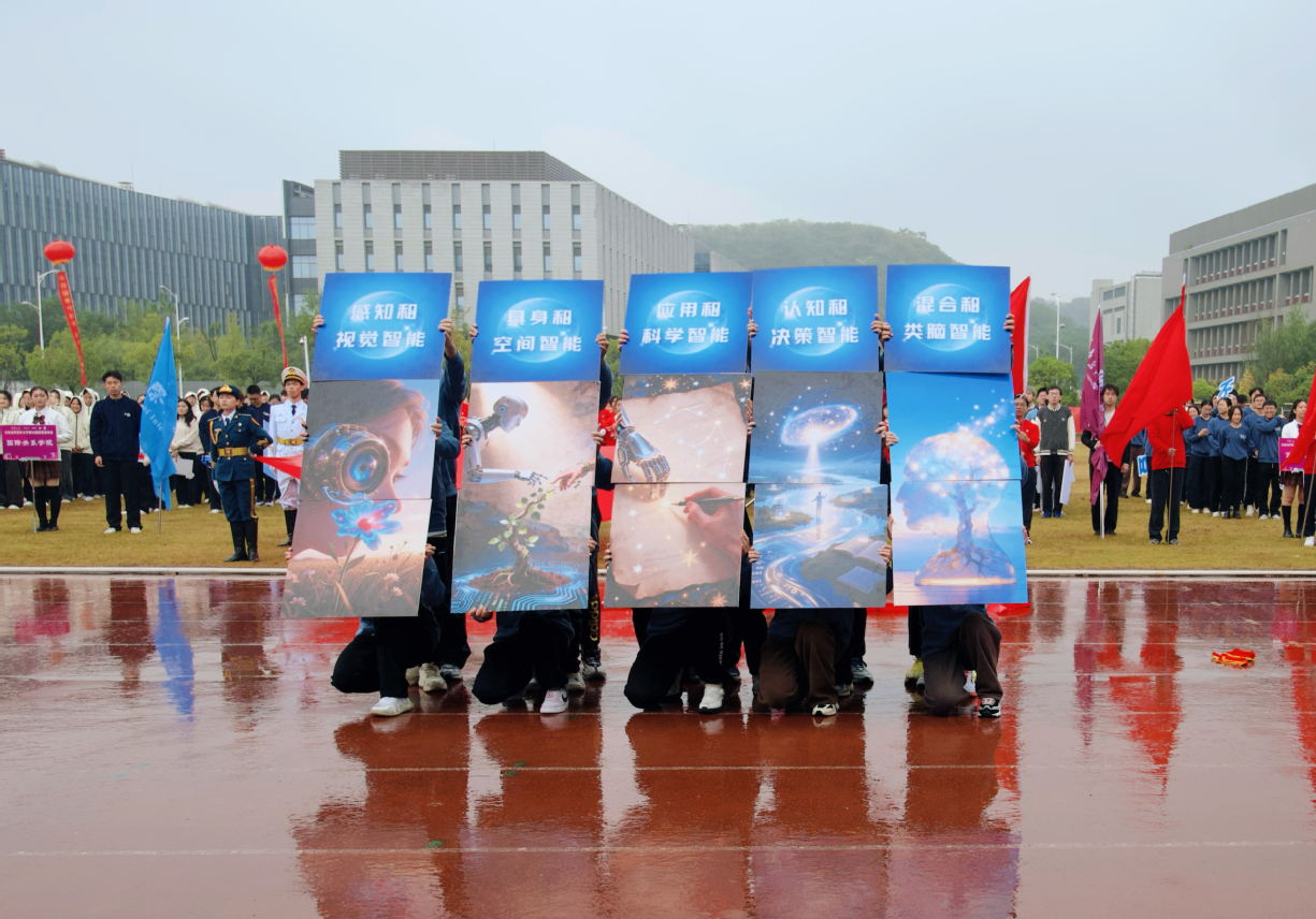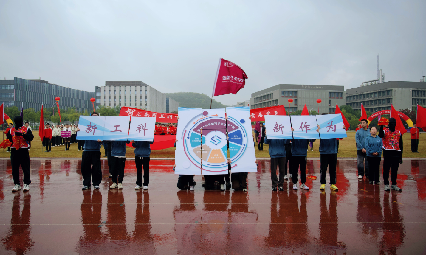 雨势渐大,却掩不住现场火热的氛围。“智汇南雍立时代潮头,科创报国谱青春华章”的横幅,彰显了学院聚焦智能前沿、助力新质生产力发展的目标。同学们手持五大智能前沿方向的立牌,从感知与视觉智能、具身与空间智能、应用与科学智能、认知与决策智能到混合与类脑智能,展现出学院深耕核心领域的学科实力与发展底气。随后,四位同学化身科技机器人,以利落的机械舞生动演绎“人工智能为擎”的理念,呼应“学科交叉为翼”的学院精神,展现出智能科技与运动活力的完美融合。