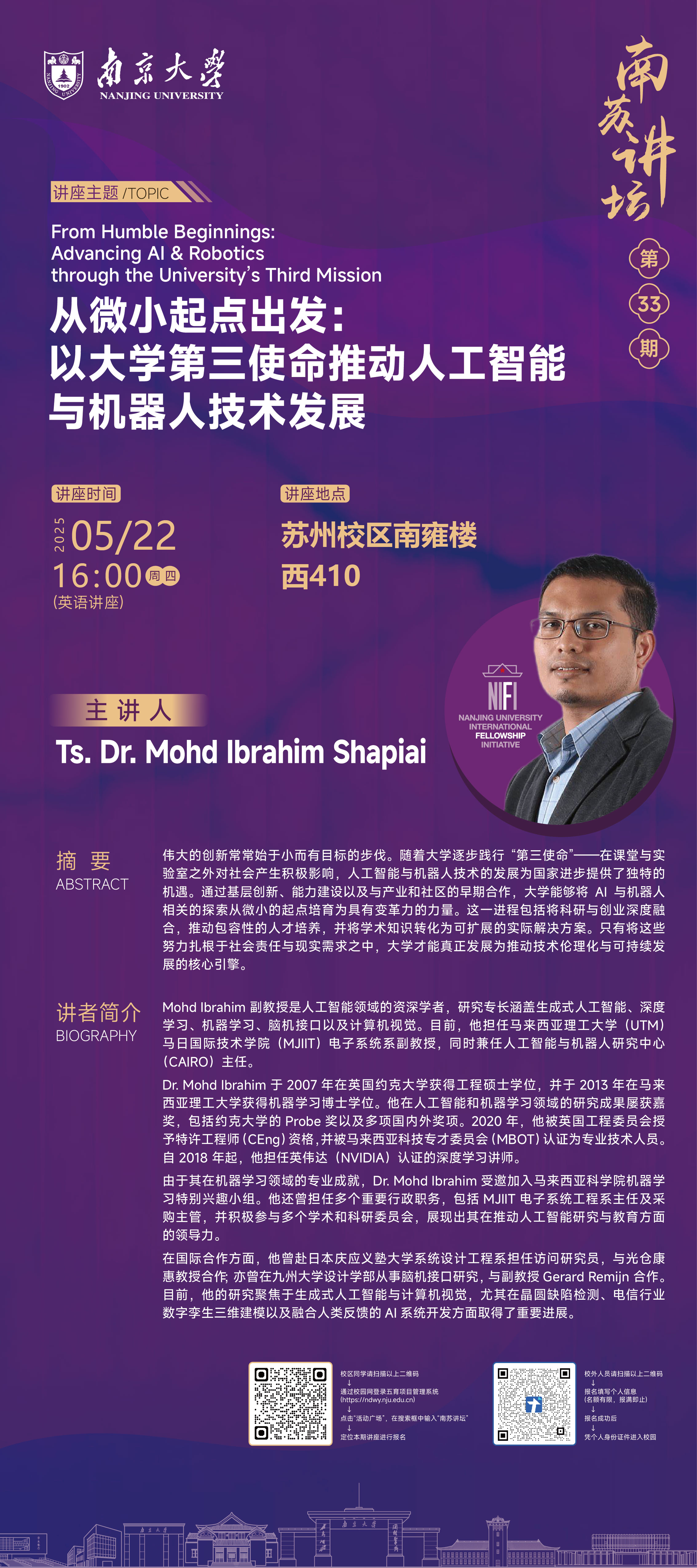 2025年5月22日(星期四)16点,Dr. Mohd Ibrahim Shapiai 将于南雍楼西区410会议室作题为《From Humble Beginnings: Advancing AI & Robotics through the University’s Third Mission》的学术报告。
