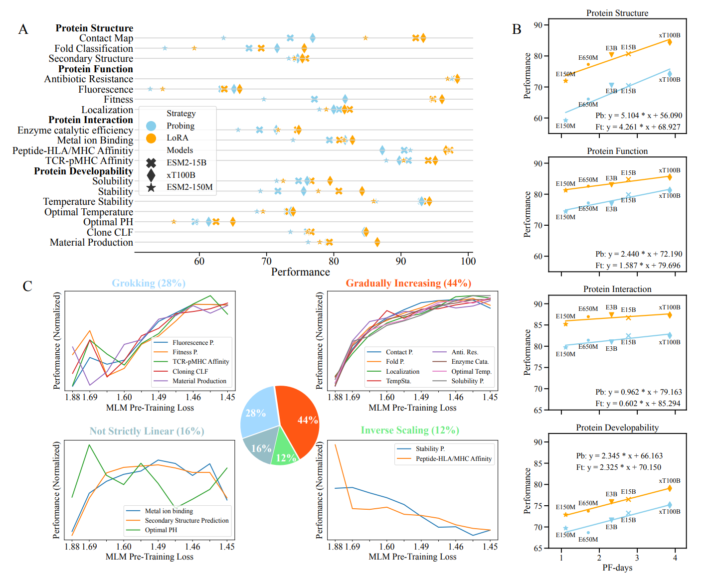 As a foundational PLM, xTrimoPGLM demonstrates outstanding performance in protein understanding tasks. Extensive and rigorous experiments employing linear probing and low-rank fine-tuning techniques show that xTrimoPGLM significantly surpasses previous state-of-the-art methods in 15 out of 18 diverse tasks, encompassing protein structure, interactions, simple functionality, and discovery (Fig. 1A). The research team also demonstrated that xTrimoPGLM achieves lower perplexity (PPL) than other reference models on two out-of-distribution (OOD) protein sets (Fig. 2B). These results validate the model's adherence to scaling laws, where larger models generally yield superior performance (Fig. 2C and Fig. 1B).