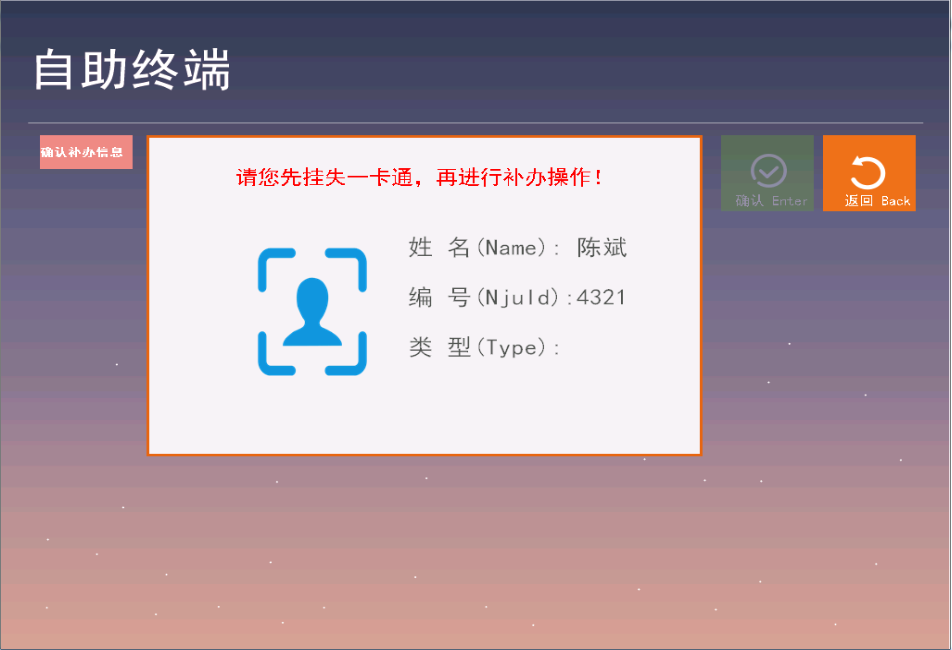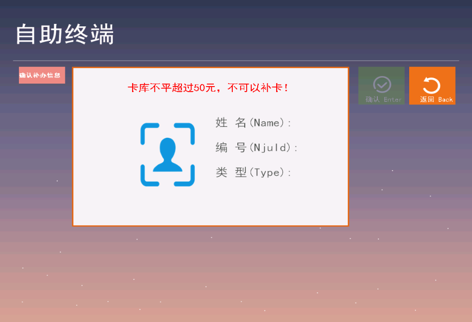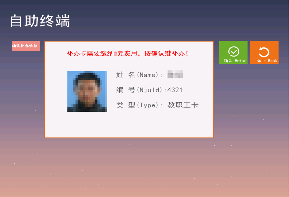 5.1校园卡账户余额应至少有20元,根据提示按确认键进行补卡,补卡工本费将从账户扣取。确认后预计等待1分钟从下方出卡口出来。