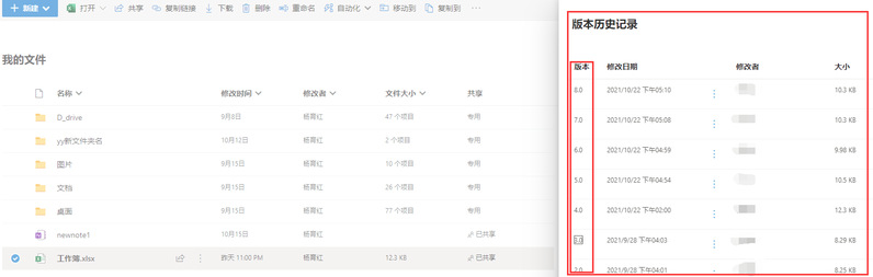 打开“版本历史记录”后,可查看修改者和编辑时间,点击对应的“版本”号,即可看到历史上编辑修改的各版本内容。