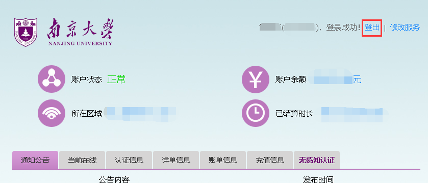 如需要退出上网认证,须点击p.nju.edu.cn右上方的“登出”(尤其在公共电脑或他人电脑上使用时,在离开前请记得登出自己账号)。