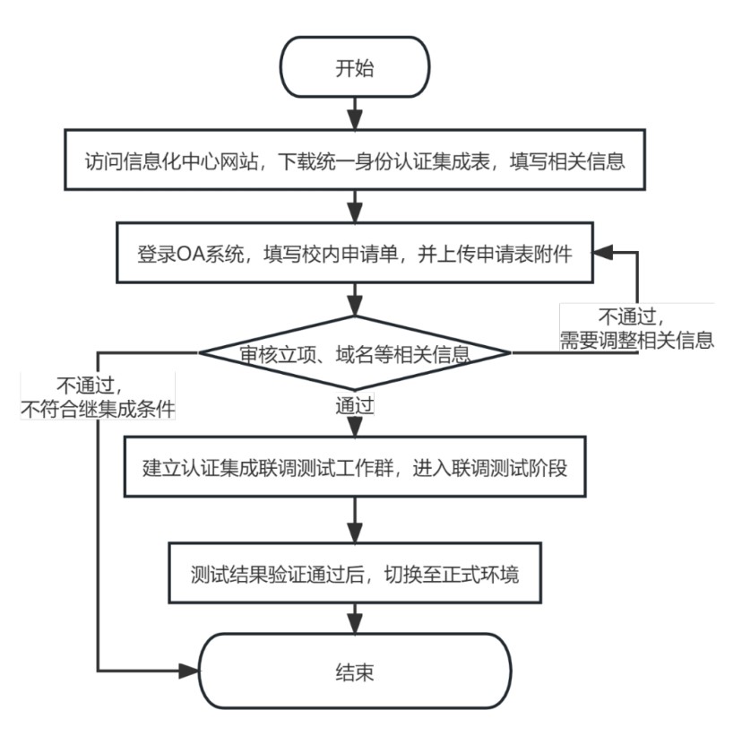 信息化建设管理服务中心老师针对《认证集成对接申请》文件中信息进行复核,若信息有误,通知申请人修正信息,若信息无误,则建立集成工作群,审核通过。