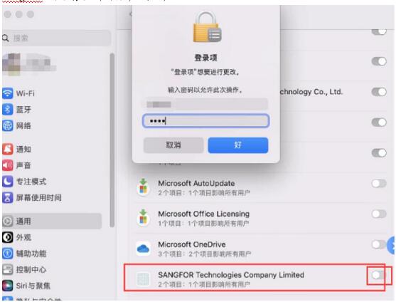 Mac电脑还需注意,须确保所有Sangfor相关的服务,没有被开机禁用,否则会导致每次重启后,VPN客户端就无法使用。办法是:选取苹果菜单 >“系统设置”,点按边栏中的“通用”,然后点按右侧的“登录项”,把含有 Sangfor 字样的服务全部开启。例如: