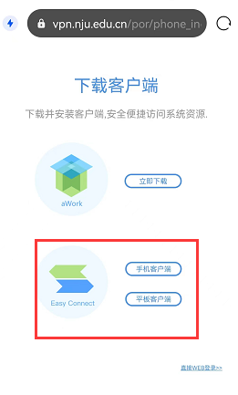 8)手机端登录如出现报错“EMM授权达到最大数”,请卸载后,重新去https://vpn.nju.edu.cn下载、安装 Easy Connect 客户端(不是aWork!)如图: