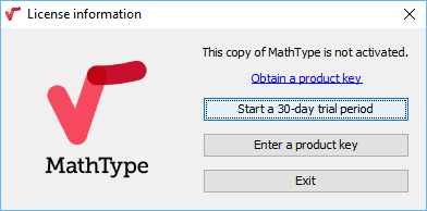 打开MathType软件,如为初次使用,可选择30天免费试用或直接使用激活码激活。