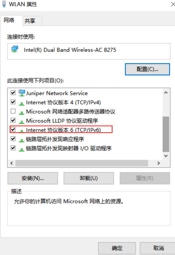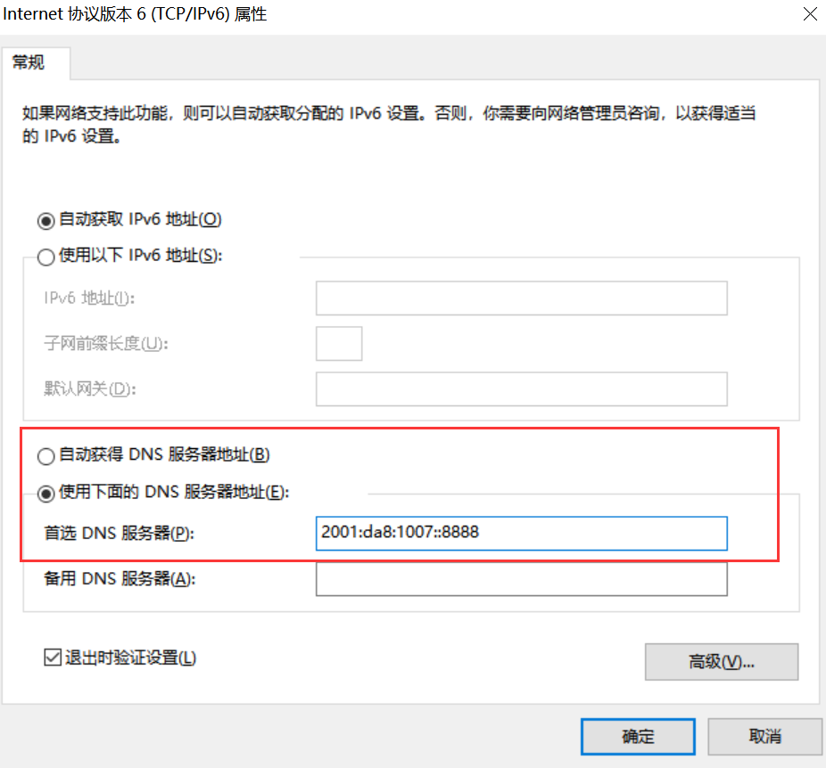五、点击属性,进入协议选择界面,勾选“Internet协议版本6(tcp/ipv6)”,并双击进入地址配置界面,在DNS位置配置 2001:da8:1007::8888 ,点击确定即可;