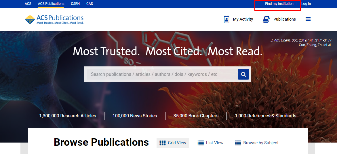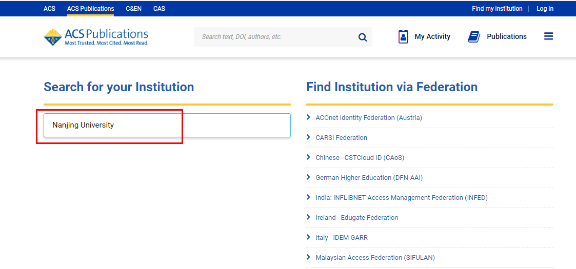 输入ACS网址:https://pubs.acs.org/,点击“Find my institution”