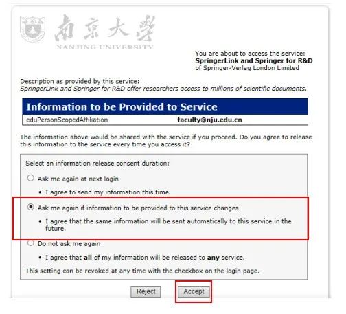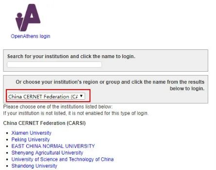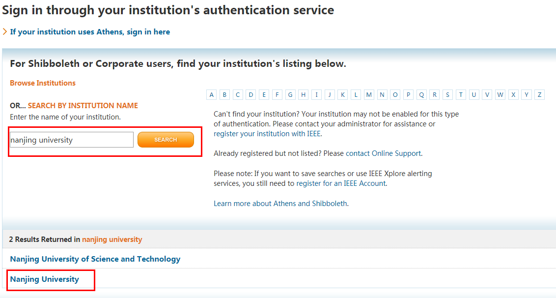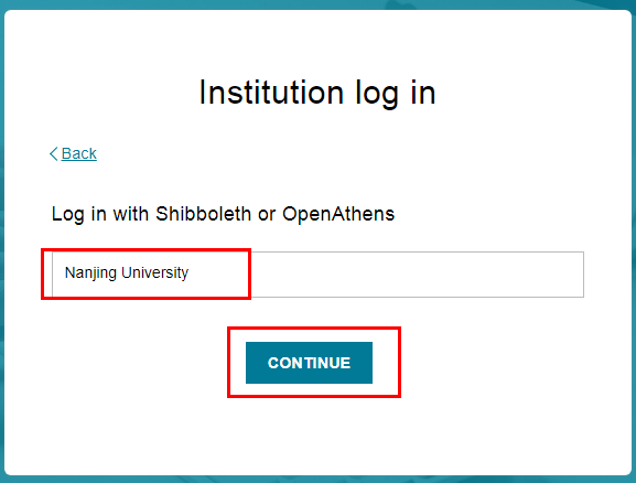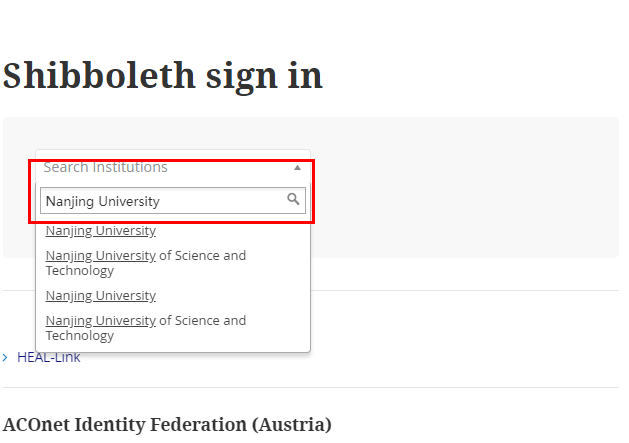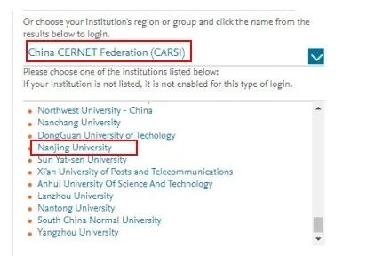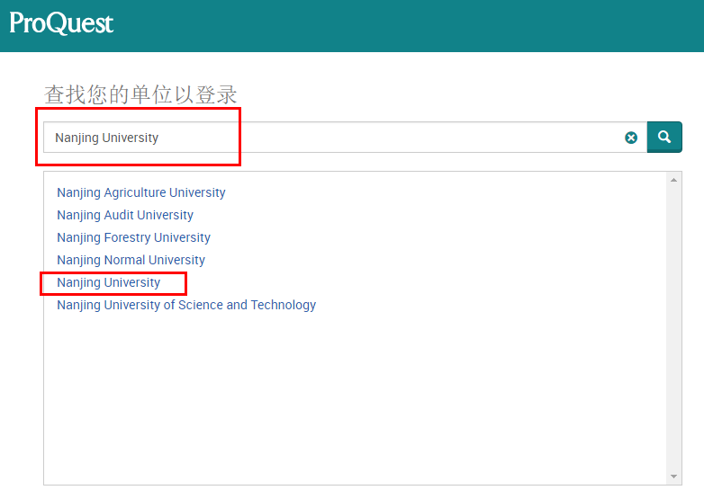 在跳转页面的“Search for your institution”搜索框中输入“Nanjing University”,并在结果中选择“Nanjing University”