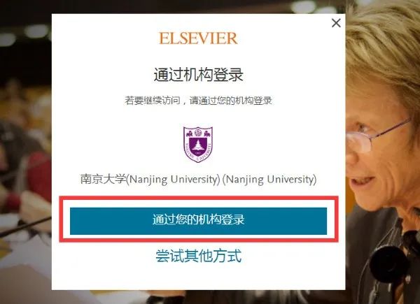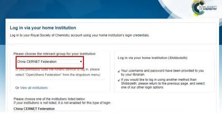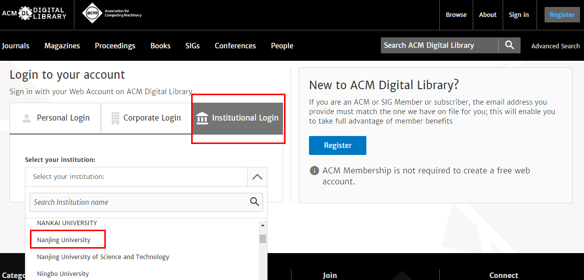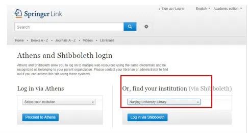 在“Login to your account”中选择“Institutional Login”,并在“Select yourInstitution”的下拉列表中选择“NanjingUniversity”