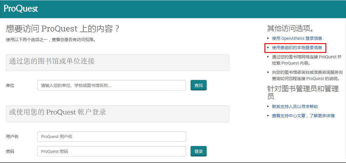 输入ProQuest网址:https://search.proquest.com,点击网页右侧“使用贵组织的本地登录信息”