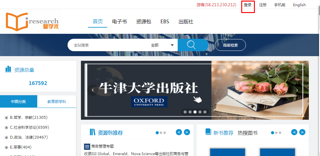 输入爱学术网址:https://www.iresearchbook.cn/f,点击右上角“登陆”