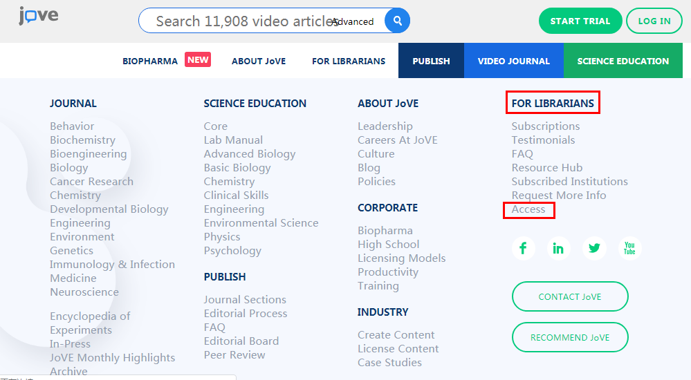 如需查看学校订阅JoVE的内容,请滚动页面至最末端,在右下角“FOR LIBRARIANS”下点击“Access”,可查看学校的订阅内容
