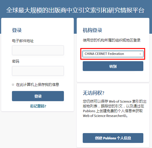输入WOS网址:https://www.webofknowledge.com/,在机构登陆下,选择机构“CHINA CERNET FEDERATION”,点击“转到”