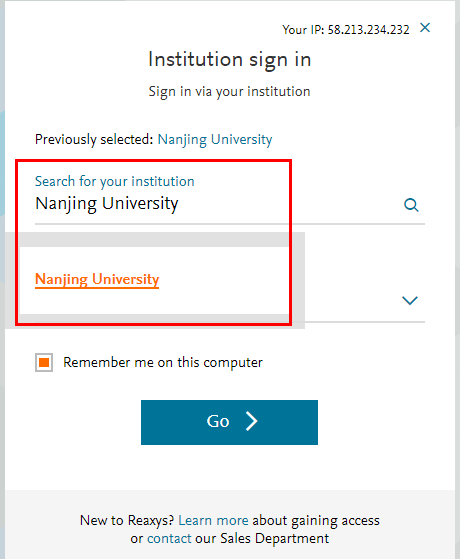 输入Reaxys网址:https://www.reaxys.com/,点击“sign in via your institution”