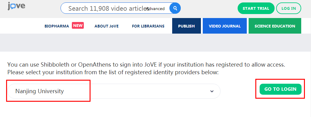 在跳转页面的“Select anInstitution”的下拉框中选择“Nanjing University”,点击“GO TO LOGIN”