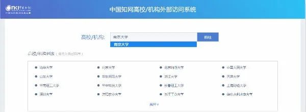 步骤一:输入中国知网(CNKI)的网址http://fsso.cnki.net/,选择南京大学后点击“前往”。