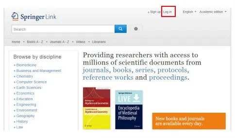 https://link.springer.com/,点击右上角的“Log in”。
