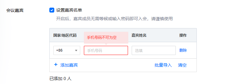 步骤二:在“会议列表”中找到 “会议嘉宾”,勾选设置嘉宾名单,输入嘉宾的手机号码和姓名;