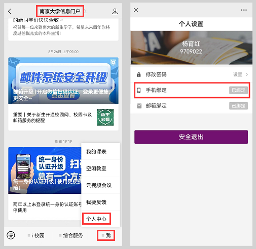 答:第一步:手机微信关注“南京大学信息门户”,点“个人中心”,进行统一身份认证(无需验证码,密码正确即可登录)。