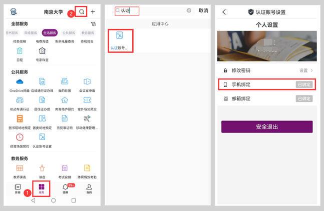方法二、手机安装“南京大学”APP->“学工号”登录->“服务”,搜索“认证账号设置”,设置手机号。